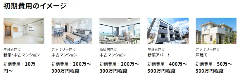 初期費用 目安 | 0〜 100 万円 (頭金) | 500〜 3,000 万円 以上 | 100〜 300 万円 (中古) |